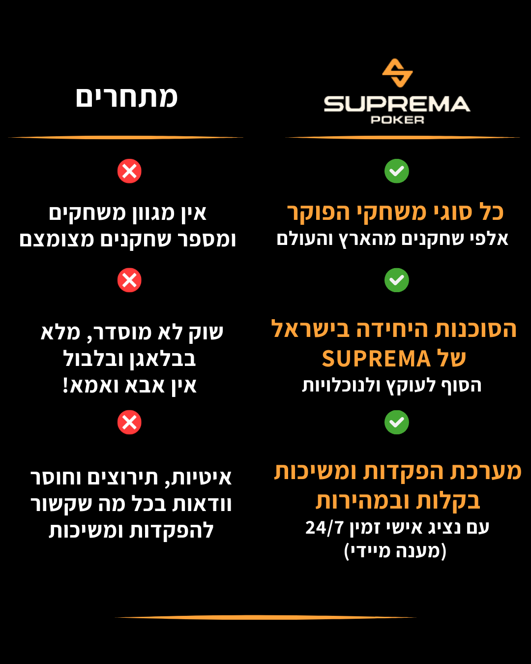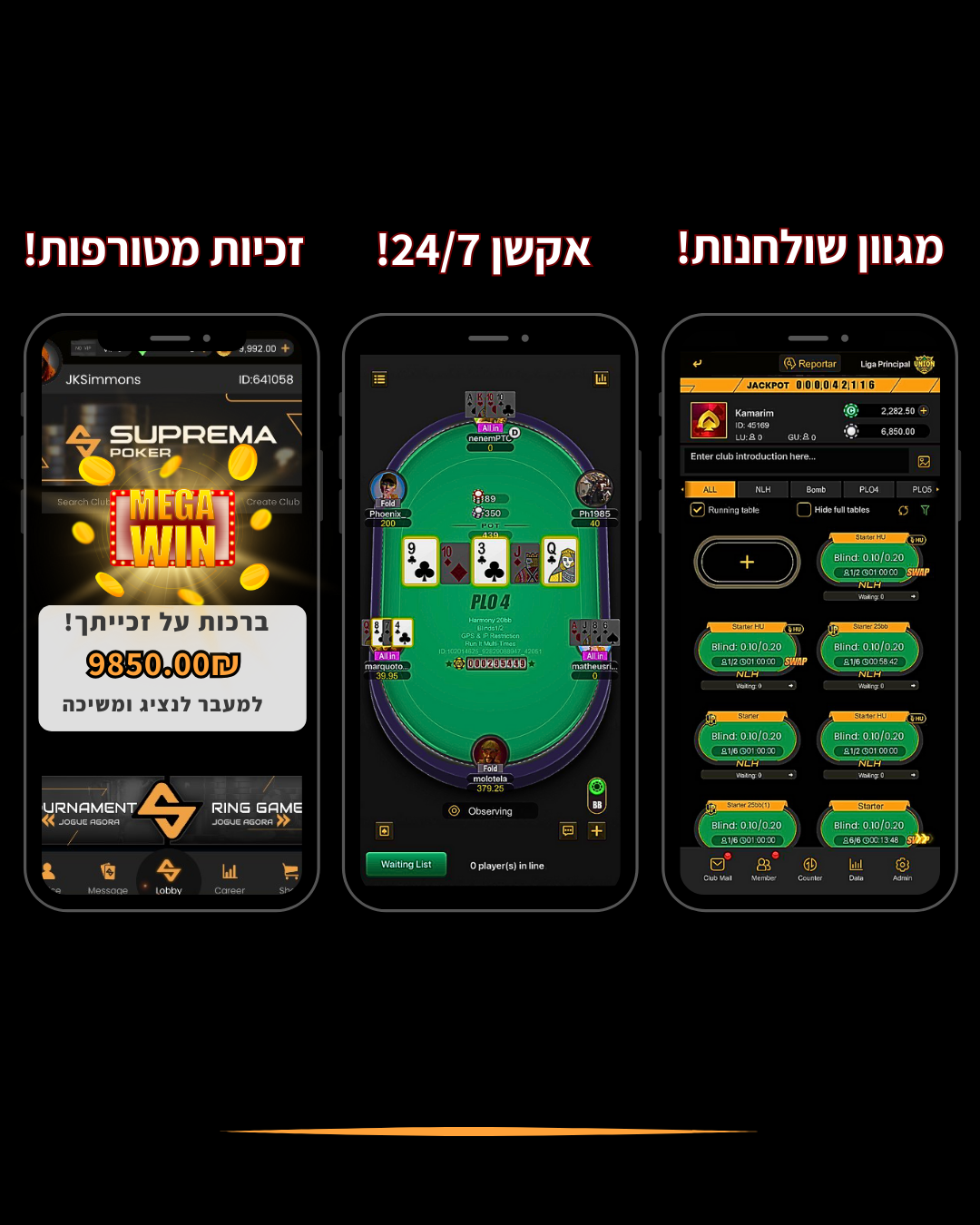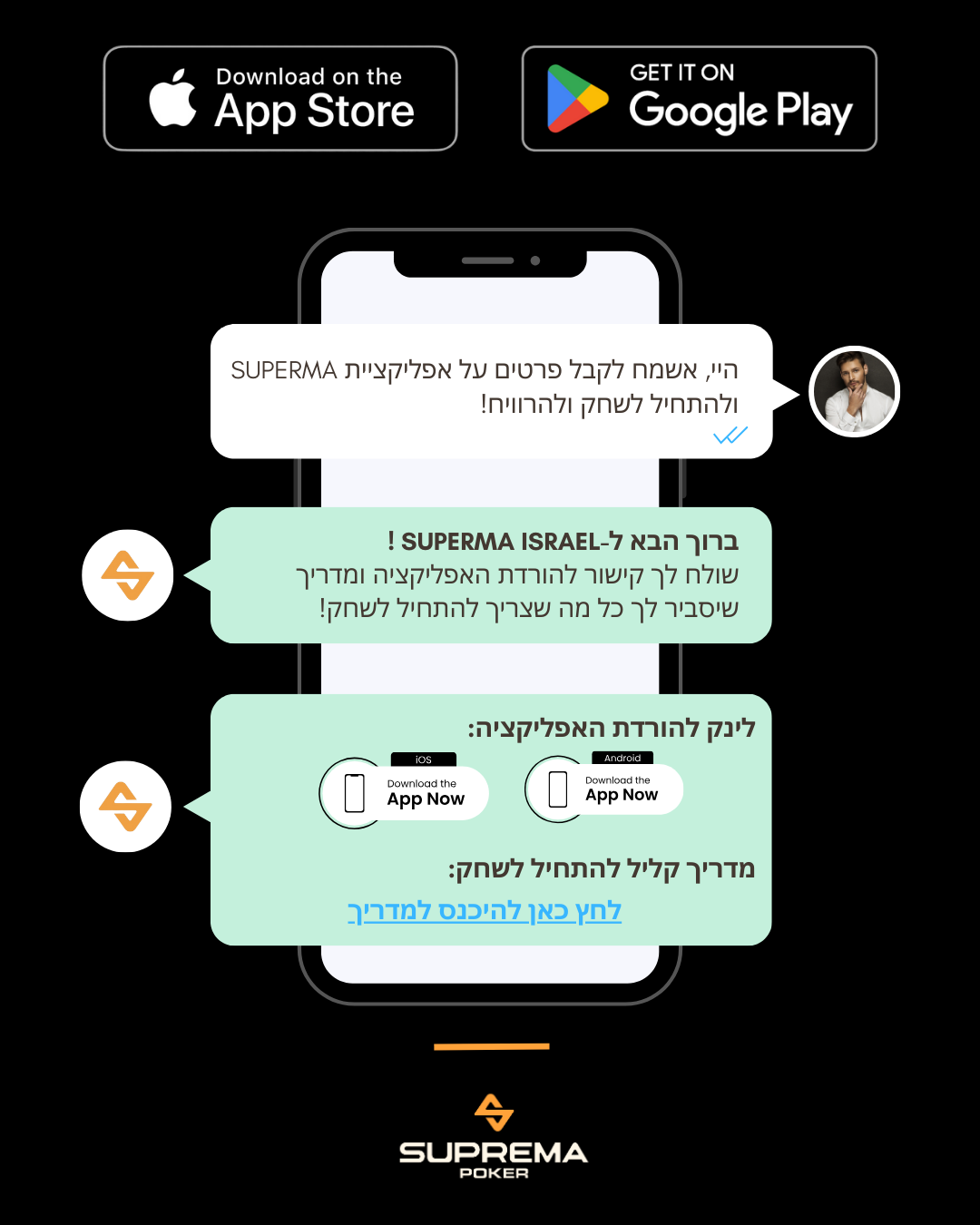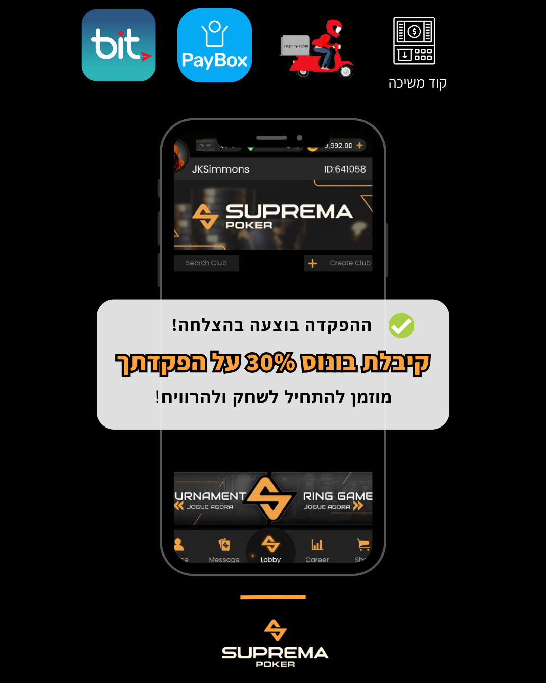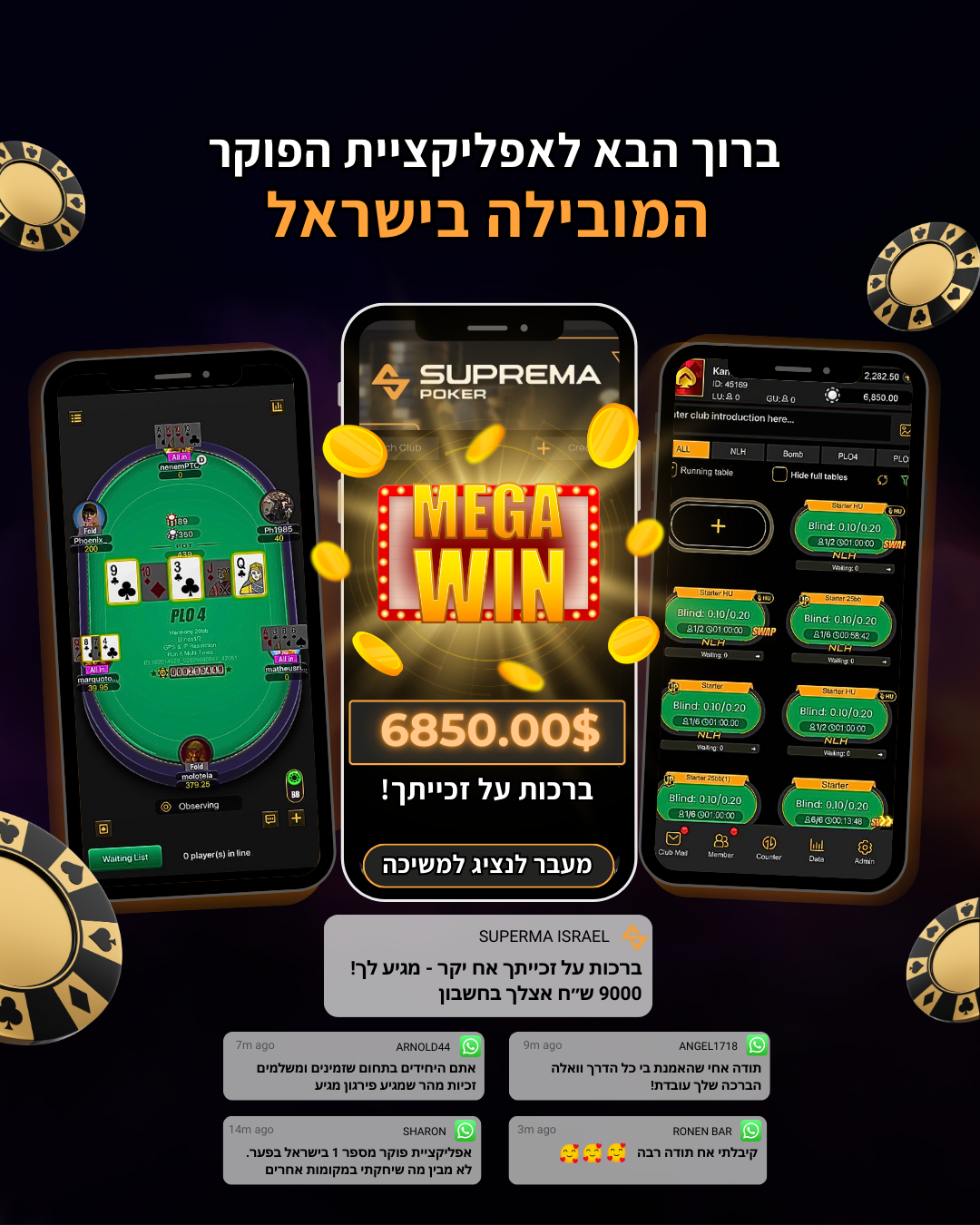 SupremaPoker היא אפליקציה בינלאומית פופולרית ומוכרת בכל העולם. אנחנו דאגנו להביא אותה לישראל, וליצור קהילה מקומית חזקה ואיכותית.